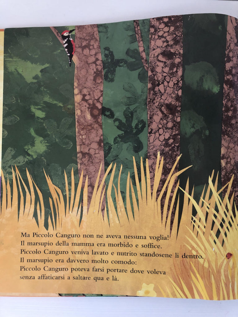 “Piccolo canguro” è la storia di un piccolo canguro che sta moolto comodo nel marsupio di mamma, e crede che niente sia così caldo e confortevole. Mentre la mamma pensa che si il momento che lui vada per il mondo sulle sue zampe, a lui piace più restare nel marsupio.