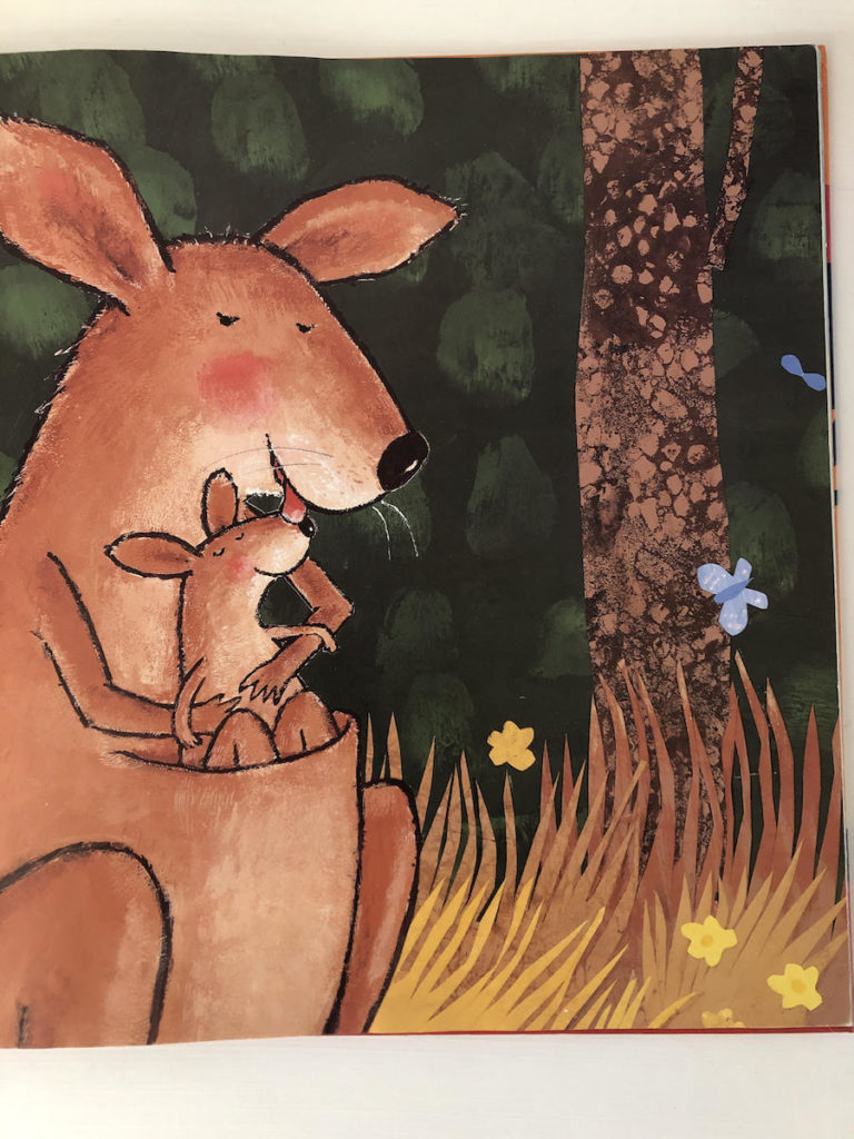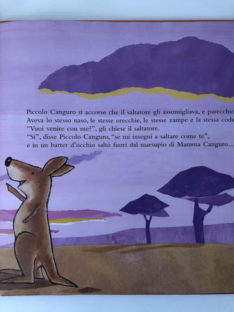 La mamma lo porta così a vedere le giraffe, le scimmie, gli elefanti.. ma niente! Il cangurino non si sente simile a loro e non è invogliato ad uscire. Finché incontra un canguro come lui e salta fuori ad esplorare il mondo.