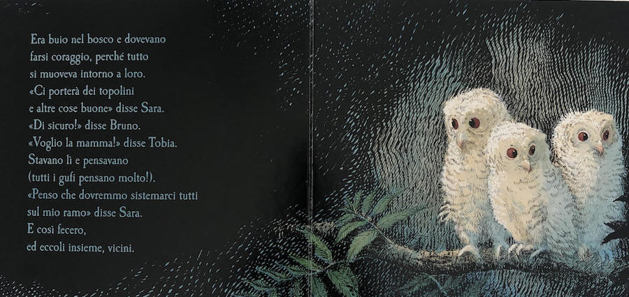 E’ notte, tutto è buio: Sara, Bruno e Tobia sono tre gufetti che vivono in un buco di un albero con la loro mamma. A un certo punto la mamma va via, forse a procacciarsi il cibo, e così vediamo i tre fratelli gufi alle prese con i pensieri di ognuno. I più grandi fanno ipotesi su dove sia andata la mamma, e si dicono che tornerà, mentre il più piccolo, Tobia, non può far altro che dire: “Voglio la mamma”. E così si fanno forza a vicenda con vari spostamenti, stringendosi su un ramo e addormentandosi vicini vicini finché la mamma non torna. Il fatto che siano presenti tre gufi facilita i bambini di età diverse a immedesimarsi in loro. Può capitare anche che lo stesso bambino si identifichi a volte nel piccolo gufo, a volte nei più grandi.